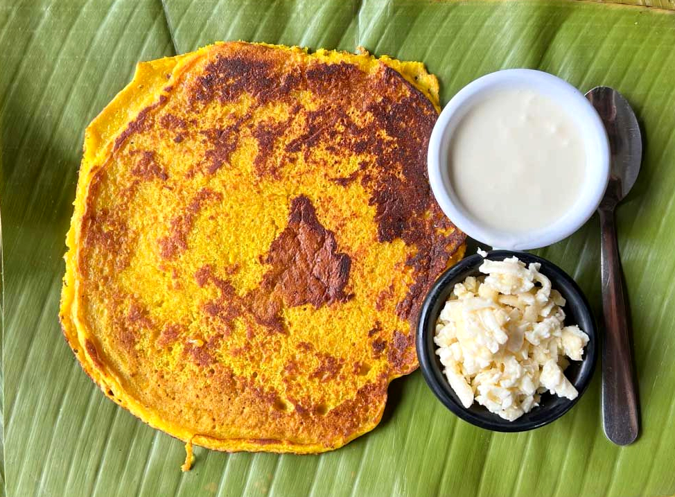 These sweet corn pancakes are a staple in the local cuisine. They originated in the Nicoya Peninsula in Guanacaste. The chorreada can be traced to pre-Columbian times. Traditional toppings include sour cream and honey. These are usually served with traditional coffee, agua dulce or other popular Costa Rican drink.