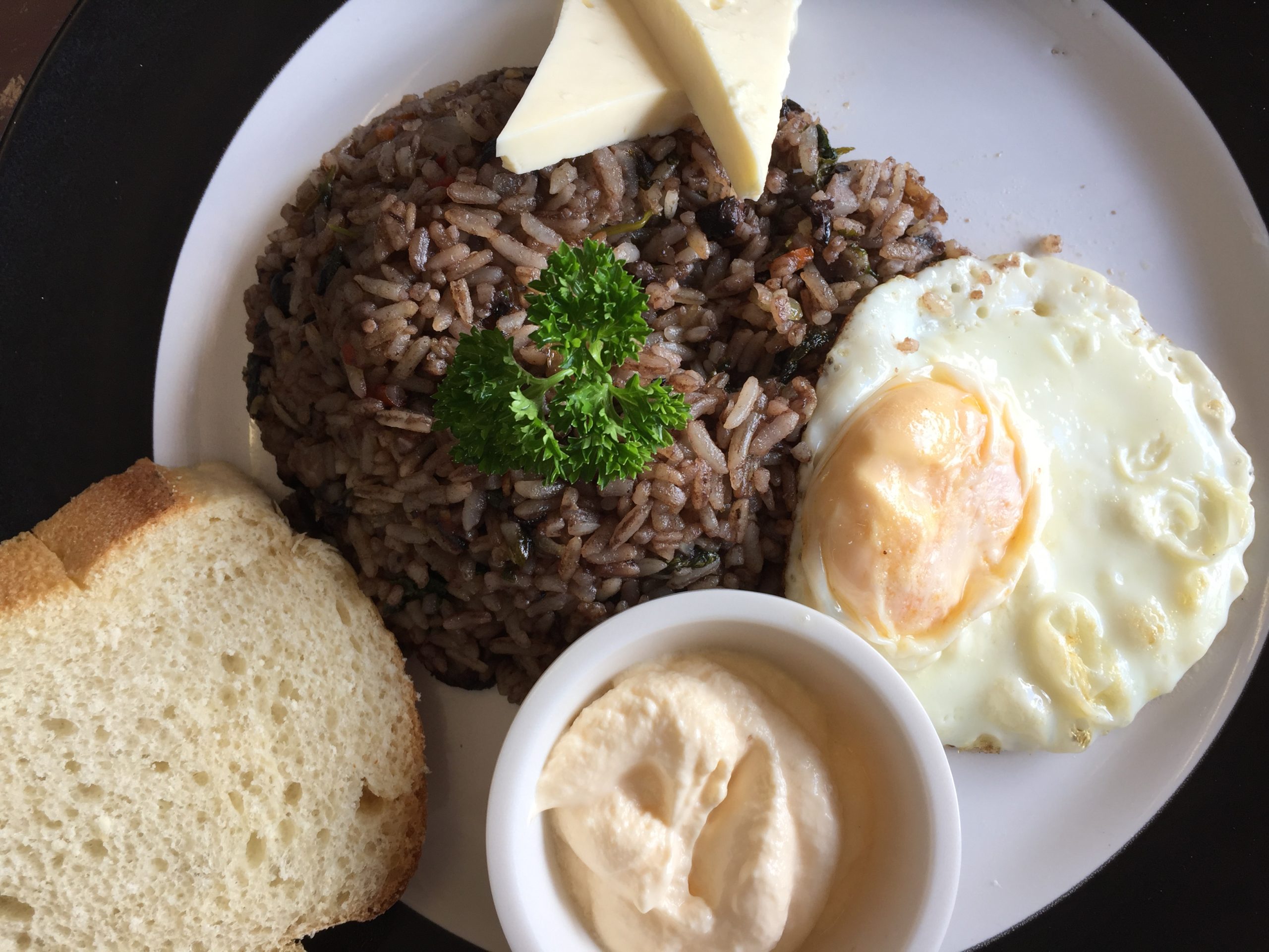 Costa Ricans like to start their morning with a gallo pinto: rice and beans cooked with onions, celery, red peppers and cilantro. Gallo pinto is often served with eggs, tortillas, fried plantains and sour cream.